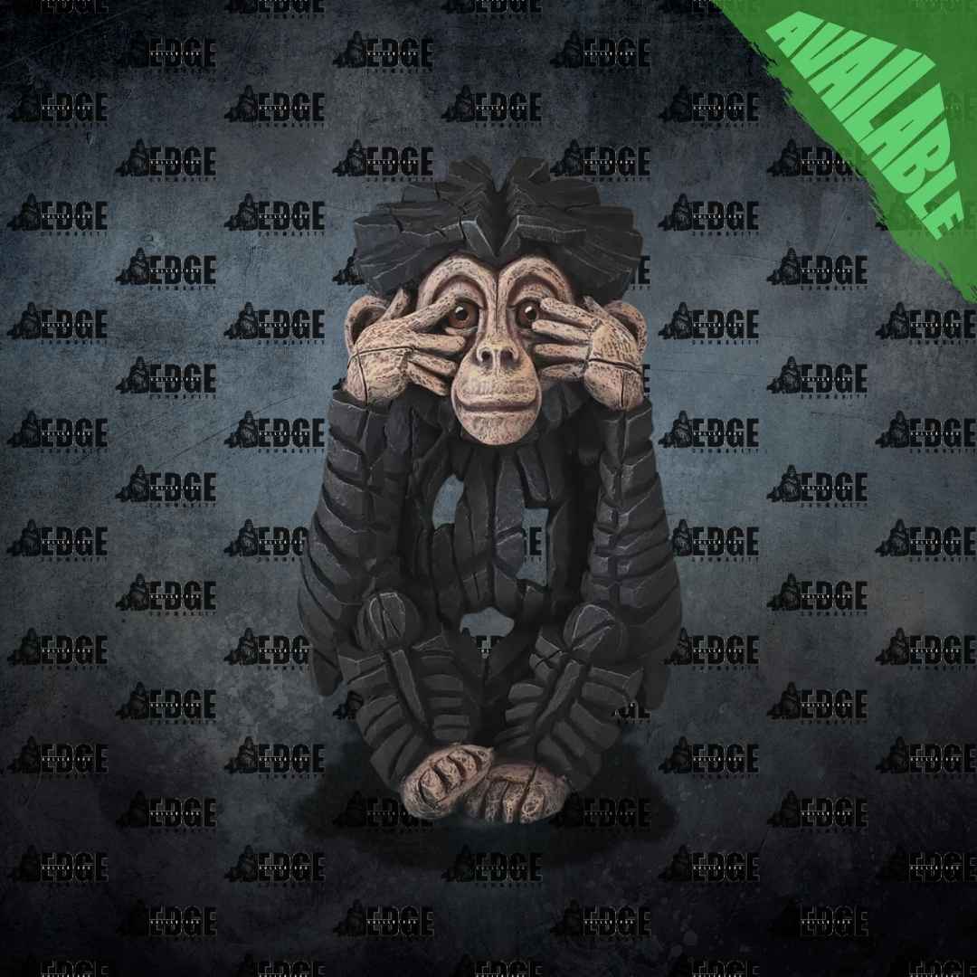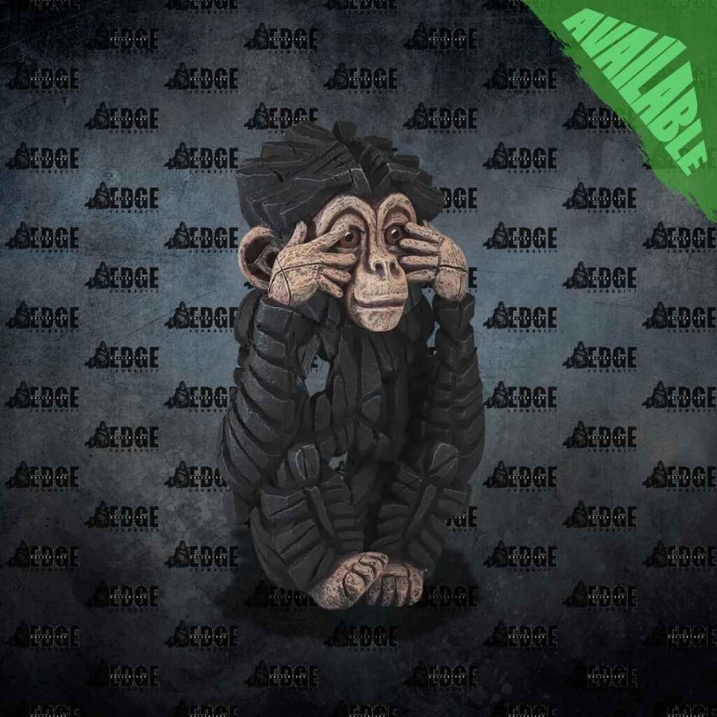Baby Chimpanzee “See no Evil”,  is part of the collection of three chimps which are based upon the Japanese proverb, “hear no evil, see no evil, speak no evil“,  also known as the Three Wise Chimps, but with a playful twist.  They are the Cheeky Monkeys of the Edge collection!